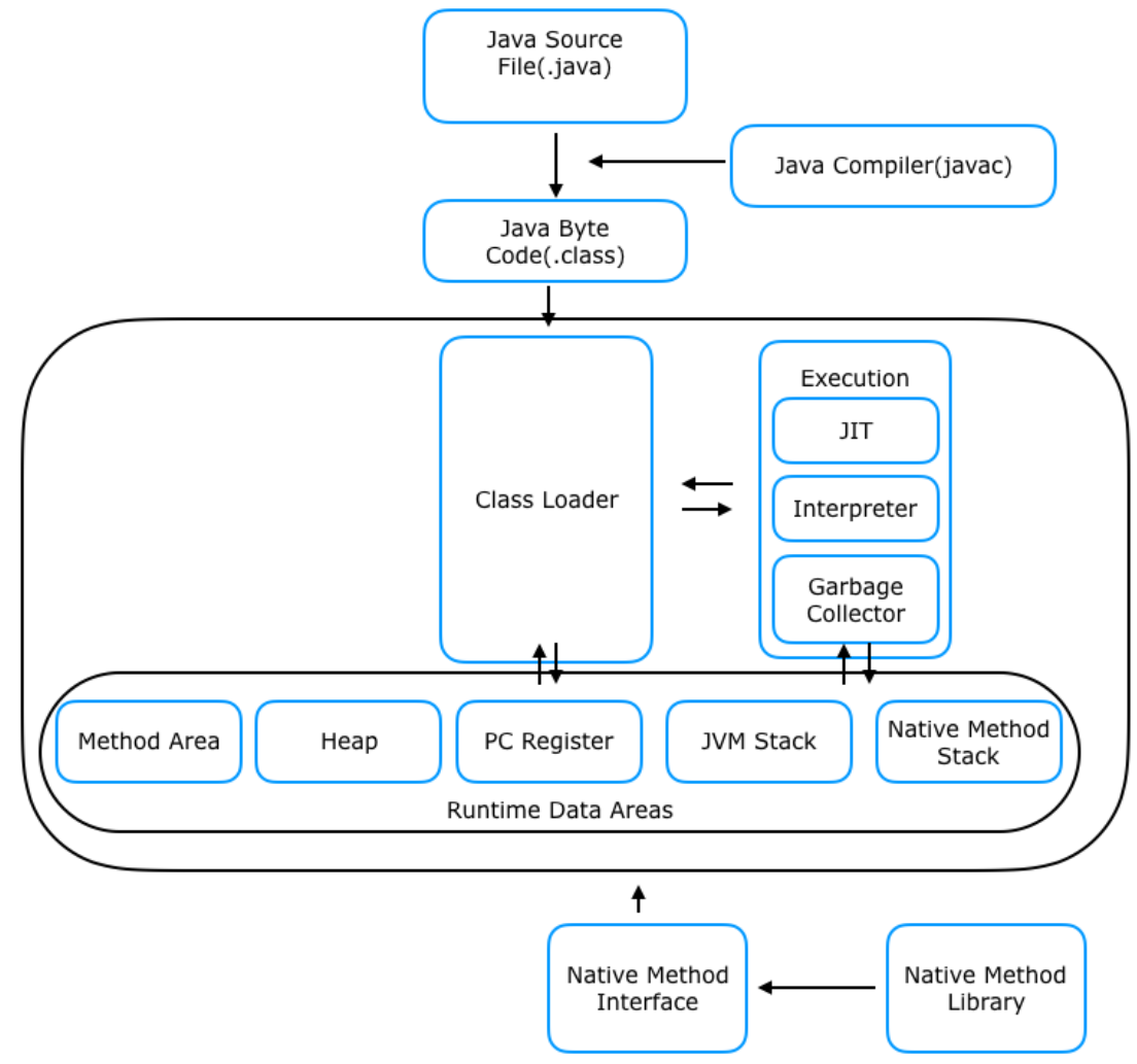 1. 바이트코드(.class)는 기계가 바로 수행 가능한 언어 X ⇒ JVM이 이해 가능한 중간 레벨로 컴파일된 코드 ⇒ 실행 엔진이 이를 로우 레벨 언어로 변경해줌!!