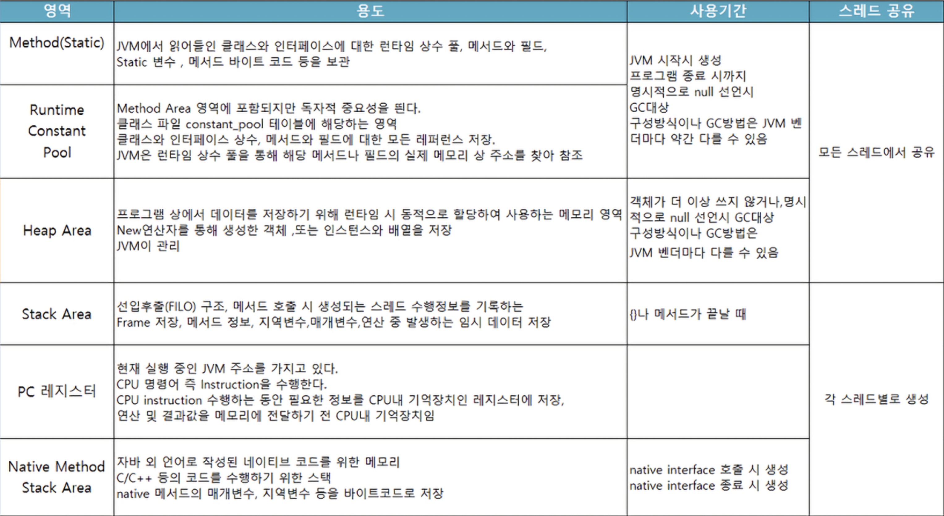 Stack Area, PC Register, Native Method Stack → 각 쓰레드마다 생성되는 개별 영역