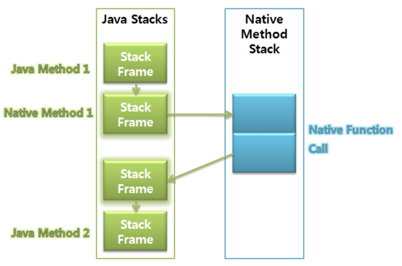 JVM 스택에 쌓이다가 해당 메서드 내부에 Native 방식의 메서드 존재 시 ⇒ 해당 메서드를 Native Method Stack에 쌓음 ⇒ Native Code 함수를 Java 프로그램 내에서도 직접 수행 가능하며, 결과도 받을 수 있음