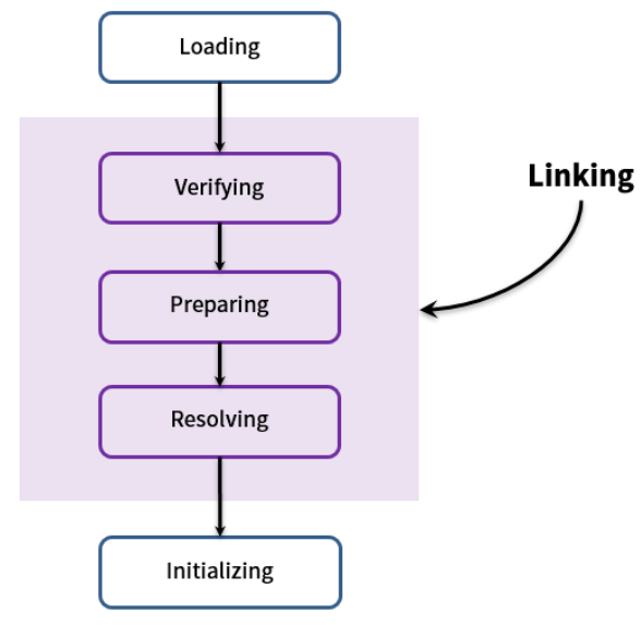 Initialization(초기화) : 클래스 변수들을 적절한 값으로 초기화 (static 필드들을 설정된 값으로 초기화 등)