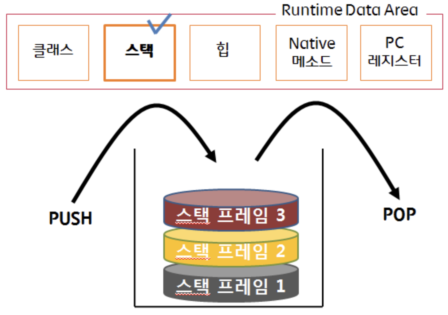 메서드 호출 시마다 각각의 Stack Frame(해당 메서드를 위한 공간)이 생성되고, 메서드 안에서 사용되는 값들을 저장하고, 호출된 메서드의 매개변수, 지역변수, return값 및 연산 시 발생하는 값들을 임시 저장 ⇒ 수행 종료 시 프레임 별로 삭제