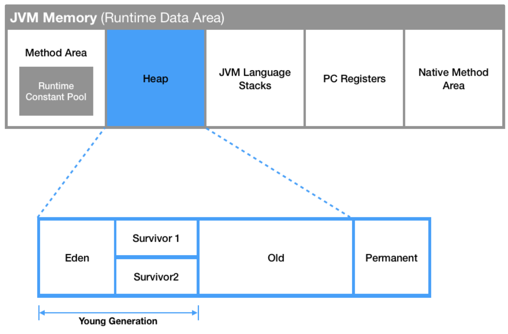 5가지 영역은 다시 Young Generation 과 Old Generation 으로 나뉨