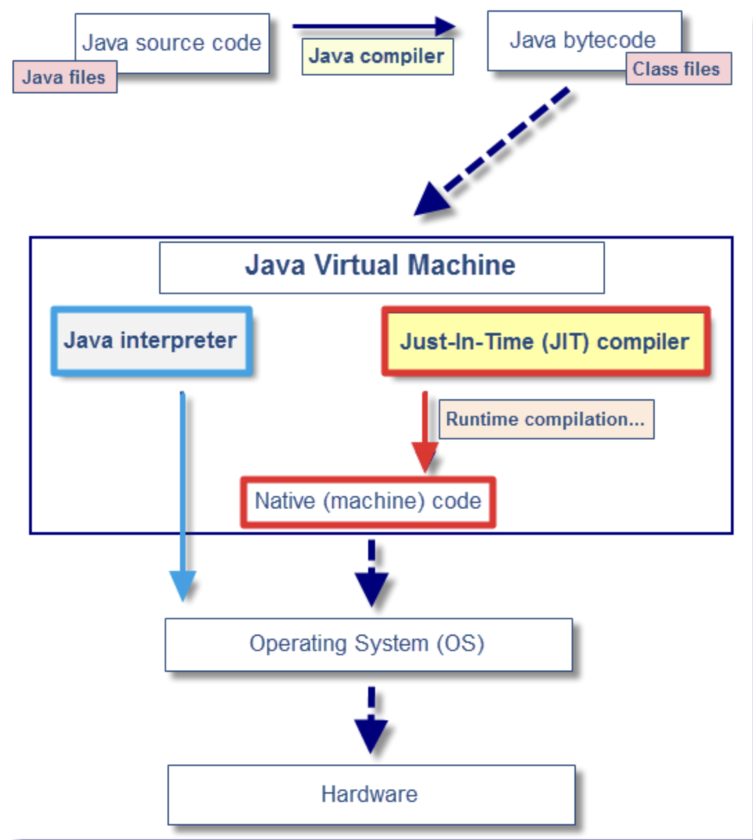 JVM 안에서 바이트 코드는 기본적으로 Interpreter 방식으로 동작 ⇒ 단점 : 같은 메서드 여러 번 호출 → 매번 해석 및 수행 → 전체적인 속도 ↓